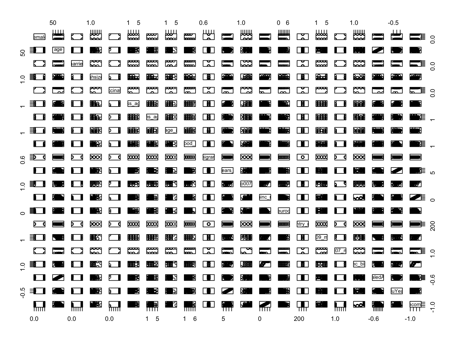 dplyr::select(female,age,married,hhsize,vaccinated,books_age10,maths_age10,language_age10,childhood_health,migrant,eduyears_mod,co007_,thinc_m,eurod,country_mod,iv009_mod) %>%